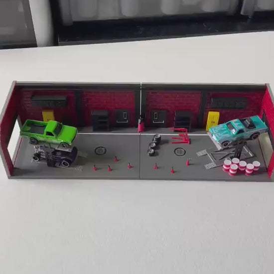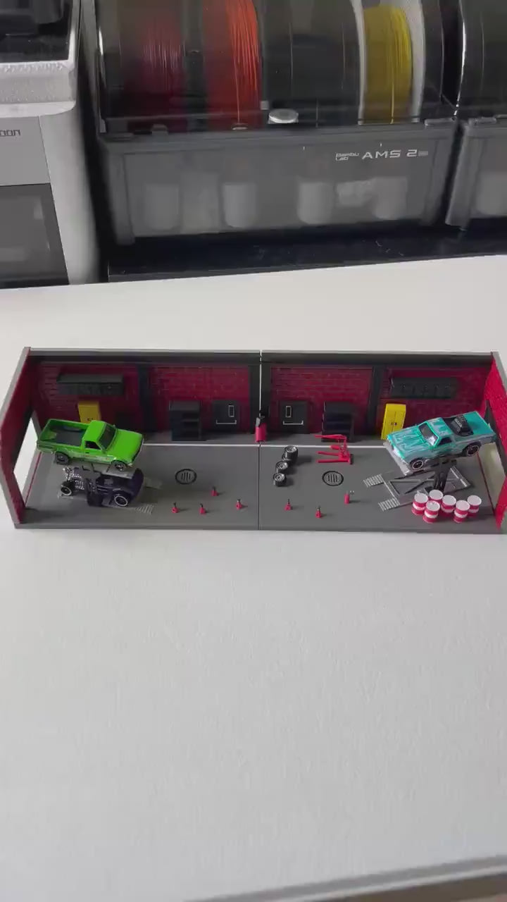 3D printed Garage/Repair shop for 1/64th scale Hotwheels, Matchbox and other diecast/toy cars. Comes with everything in photos (except the cars of course). Jack stands, lifts, oil containers, cabinets, etc all included!!!